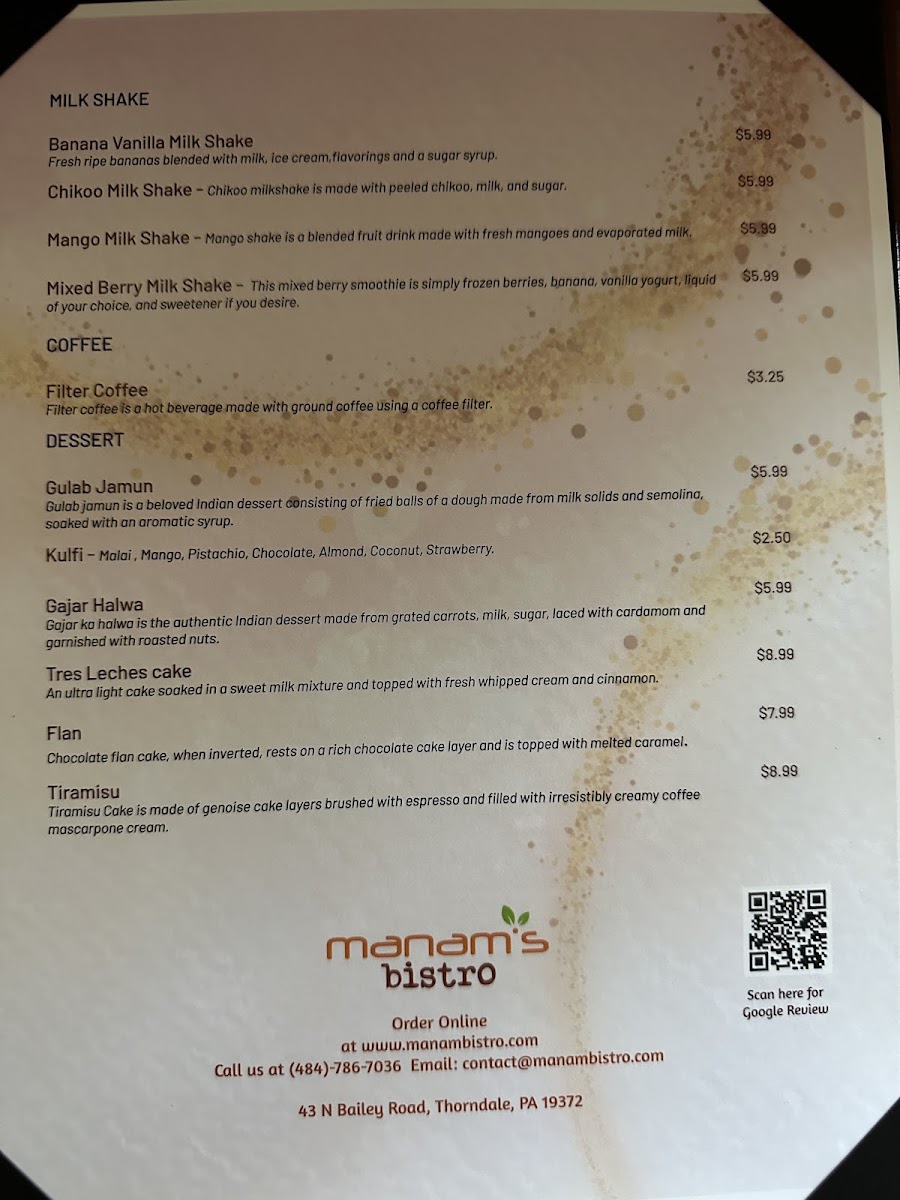 If you are searching for a place that seamlessly blends delicious cuisine with a cozy ambiance, look no further than Manam's Bistro. With a commitment to quality, a diverse menu, and a delightful dining experience, Manam's Bistro is poised to become a favorite in your culinary repertoire. Do visit soon, and let yourself be carried away by the flavors of India, right here in Thorndale!